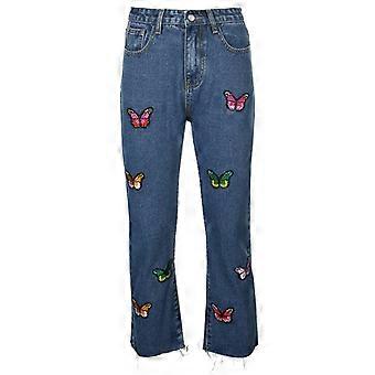 Mulheres Casual Loose Baggy Jeans Cintura Alta para Borboleta Bordada Perna Larga Calças Retas Denim Azul Desfiado Bainha Calças
