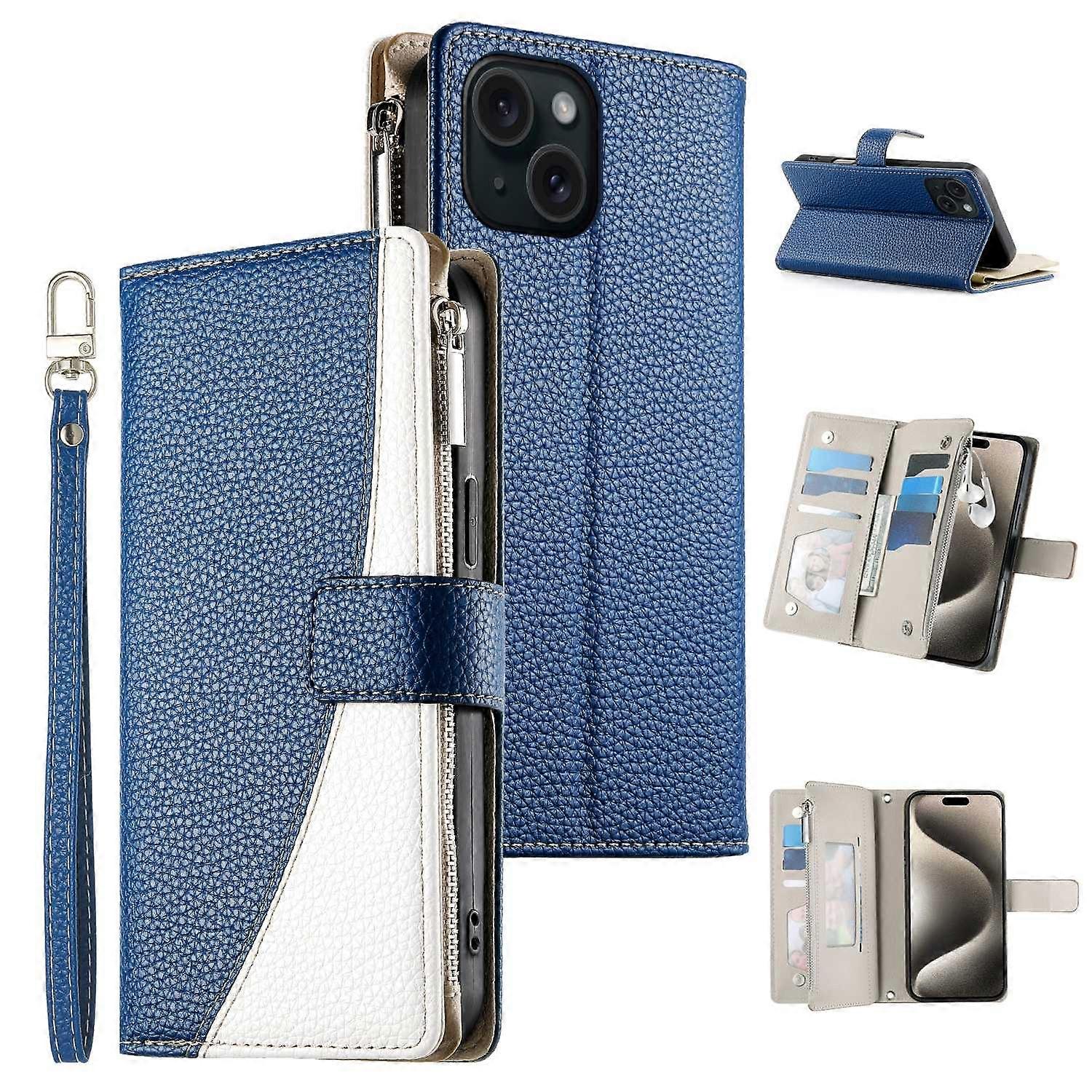 For iPhone 15 Case Zipper Pocket Wallet Color Splicing Leather Flip Phone Cover with Straps