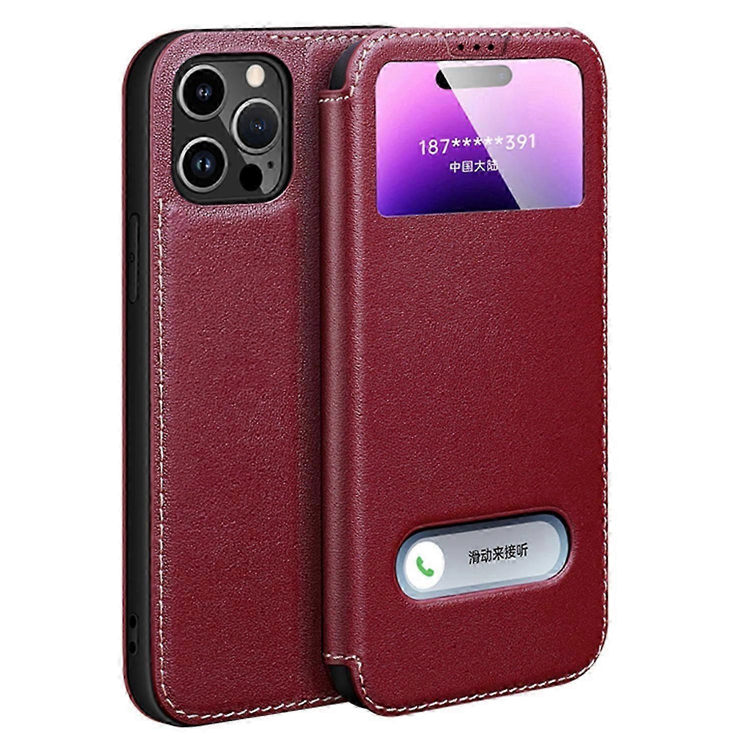 For Iphone 16 Pro Max Case Genuine Cow Leather View Window Phone Cover - Brown