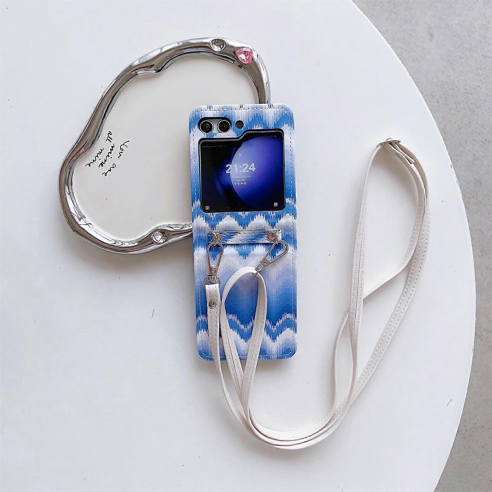 For Samsung Galaxy Z Flip7 FE 5G/ Z Flip6 5G/ Z Flip5 5G Case Wavy Edge Design PU Leather+PC Cell Phone Back Cover with Long Strap