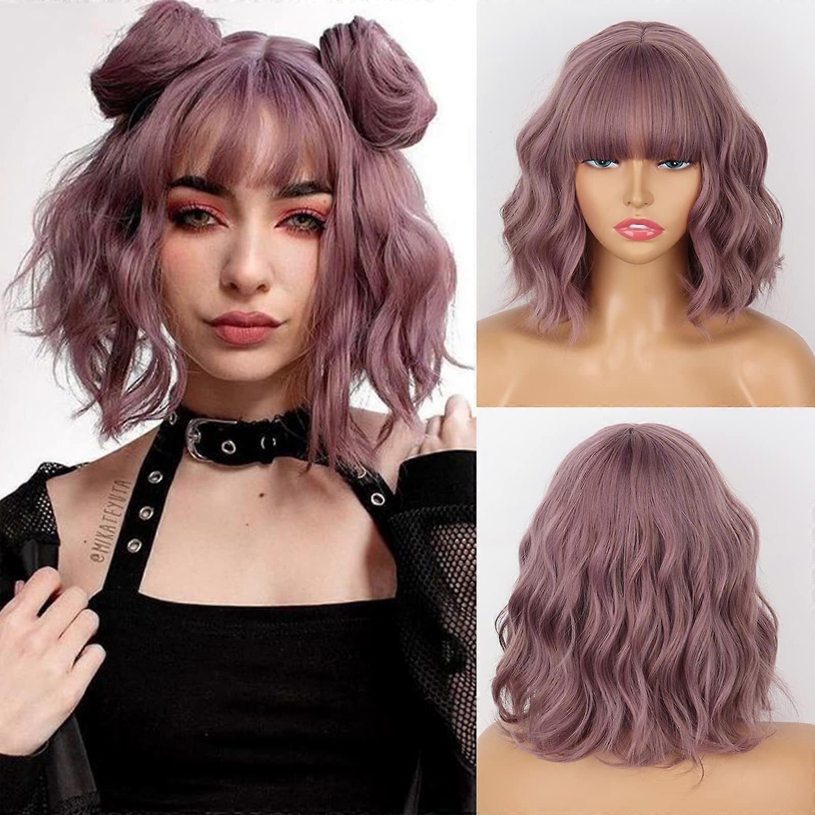 Purple Bob Wig Short Wavy Heat Resistant Synthetic Hair with Bangs 14 Inch for Women