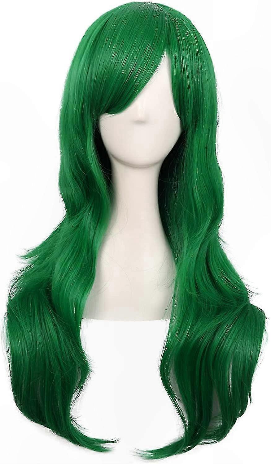 28 Inch Long Curly Cosplay Wig with Side Bangs for Women Girls Grass Green