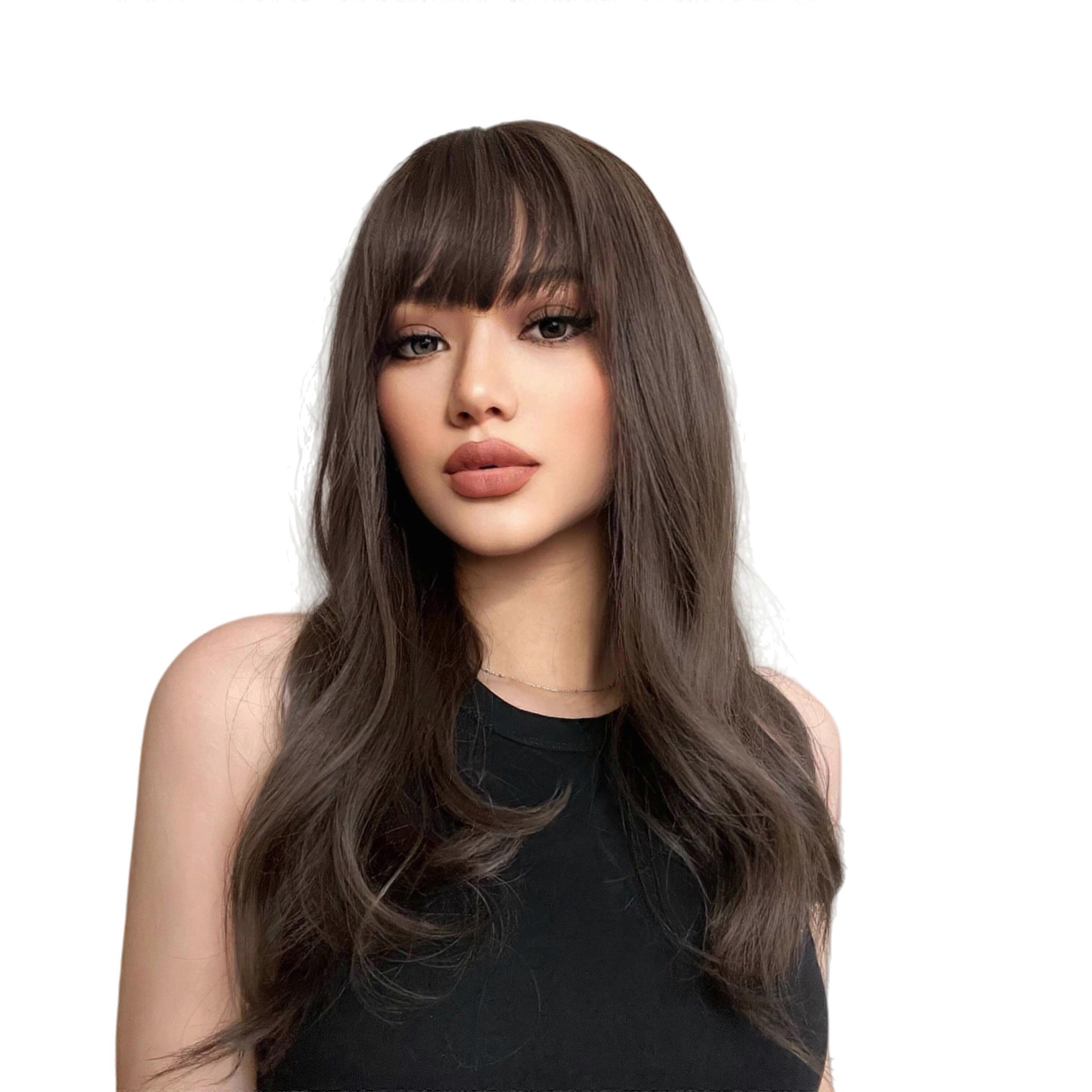 Brown Wavy with Bangs Medium Machine Made Heat-Resistant Glueless Wear and Go Wig - Natural Look for Daily Wear