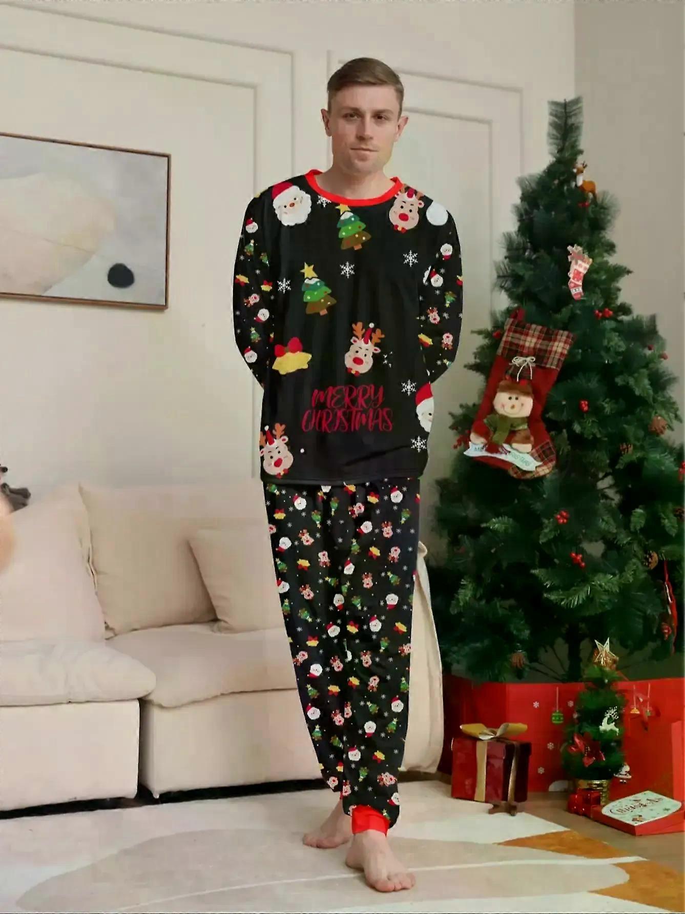 Men's Red Christmas Pajamas Cute Santa Claus & Tree Pattern Merry Christmas Sleepwear Comfortable Soft Cotton Pajamas Set