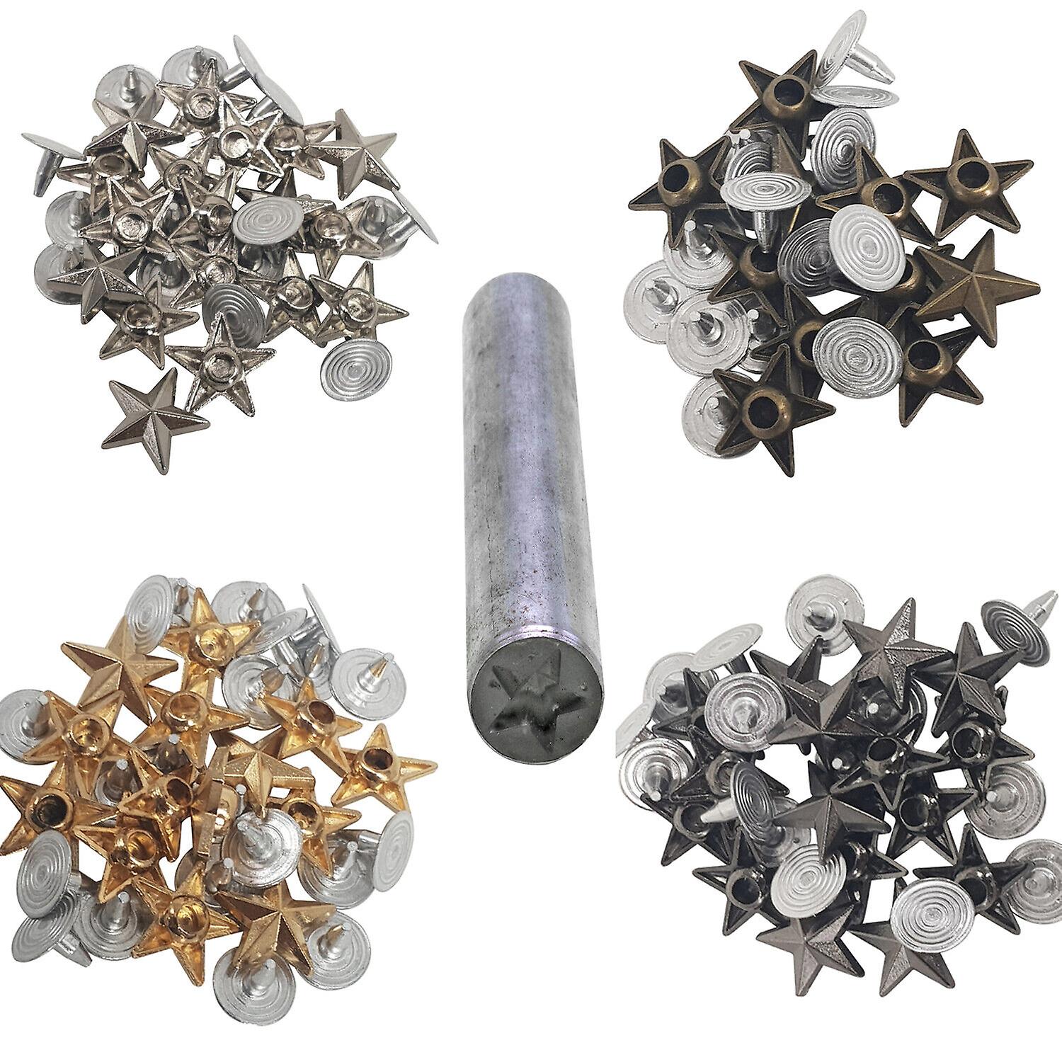Pin Type Star Studs with Hand Tool Set For Leather Jacket Handbags Coats 11/19mmSpecification:Stud Material: BrassPin Material: AluminiumStuds Shape: StarStuds Size: 11mm, 19mmStuds Colour: Gold, Silver, Bronze, GunmetalStuds Qty: 50PcsHand Tool Material: IronHand Tool Qty: 1pcThese set of star studs are made of brass and hand tool are made of iron which makes them robust, lightweight and durable enough to withstand regular wear and tearThese lightweight studs can be used to decorate thick fabrics such as denim, leather, etc.All these star studs come with a smooth surface finish and have a metallic colour coating making these rivets much more attractiveThe star studs can be applied on any fabric with ease by using a hand toolStar studs are of great use in designing and decorating clothing made of leather & denim fabrics such as jackets, trousers, footwear and much other DIY leather craft projects
