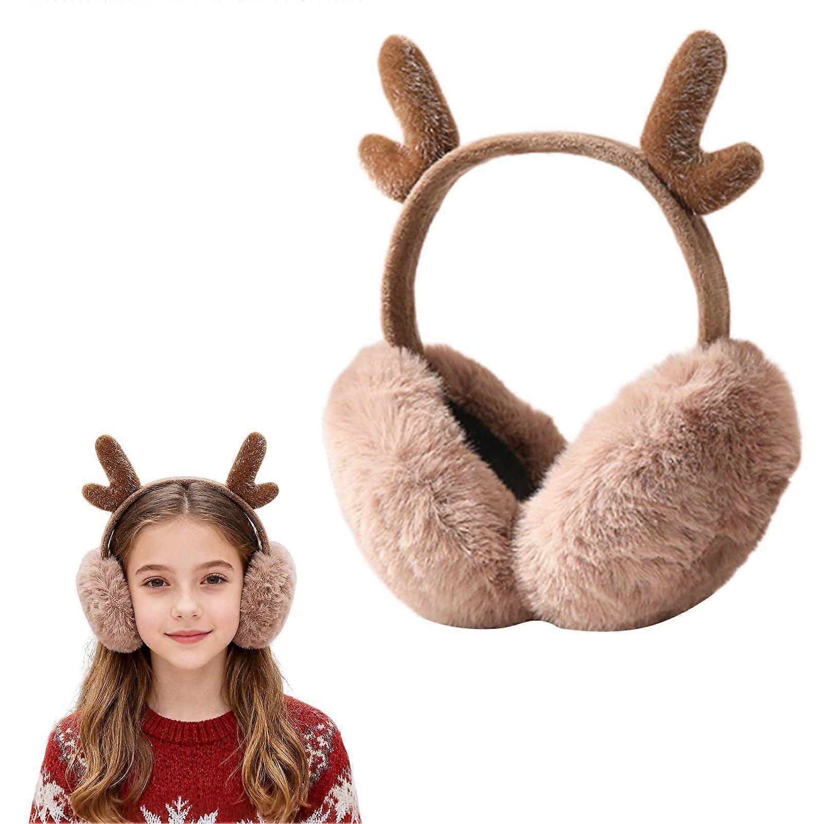 Christmas Antler Ear Muffs for Girls Kids - Adjustable Fuzzy Plush Earmuffs, Warm Winter Ear Warmers for Outdoor Cold Weather, Cute Holiday Gift for C