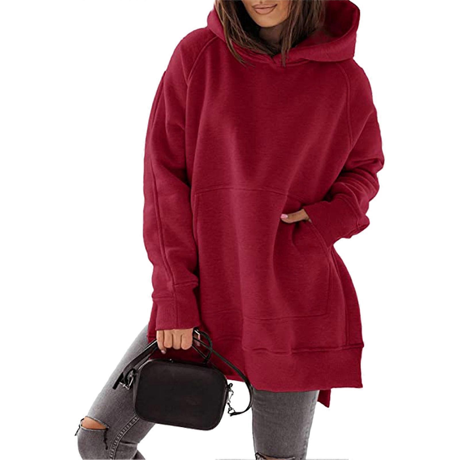 Hooded Pullover Split Hem with Pocket Hooded Sweatshirt Long Sleeve Thick Oversize Hoodie for Women