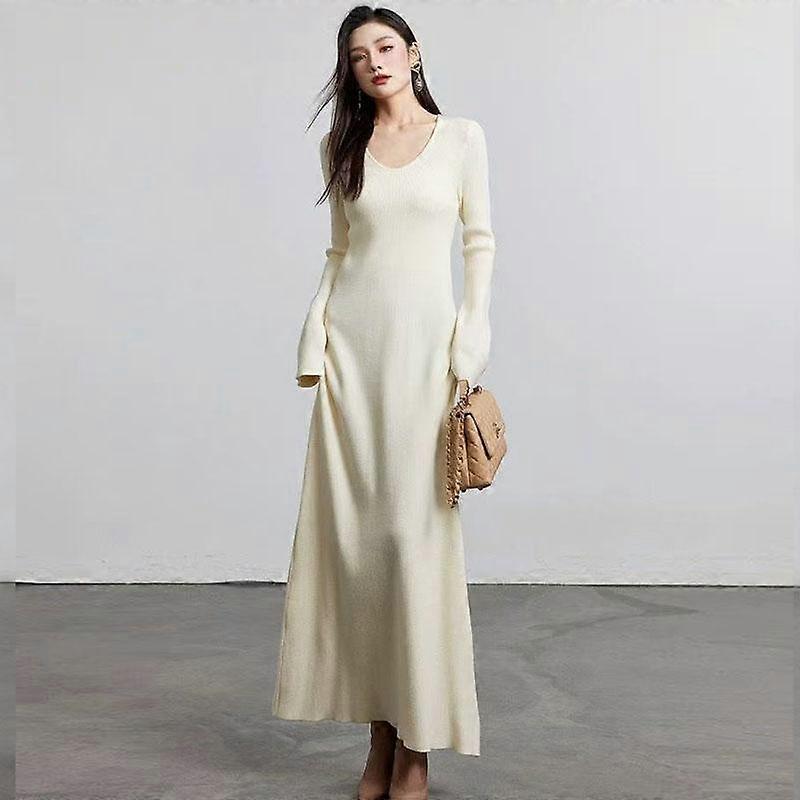 Autumn Pullover Solid Color V-neck Pit Strip Knitted Dress for Women in Autumn and Winter Bottom Long Waist Pack Hip Skirt
