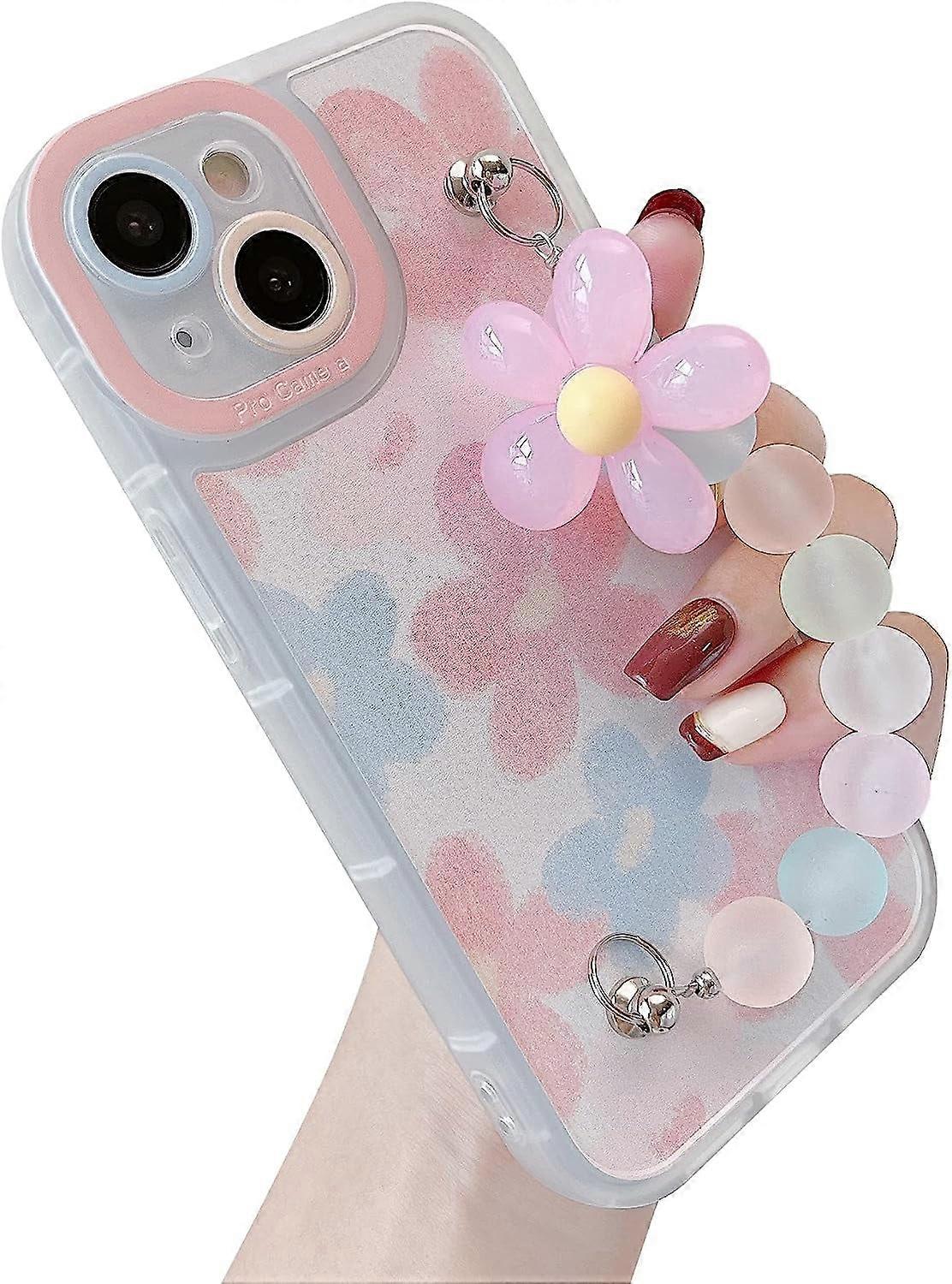 Cute Flower Floral Wrist Strap Chain Bracelet Clear Soft Compatible with iPhone Case for Women Girls (Pink,compatible with iPhone 14 Plus)