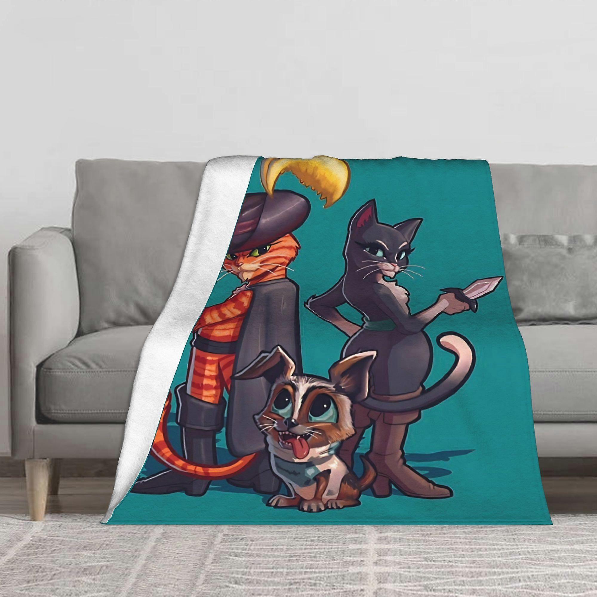Puss in Boots Flannel Blanket - Soft All-Season Throw with Puss in Boots, Kitty & Chihuahua Characters - Teal Background-qazxc95