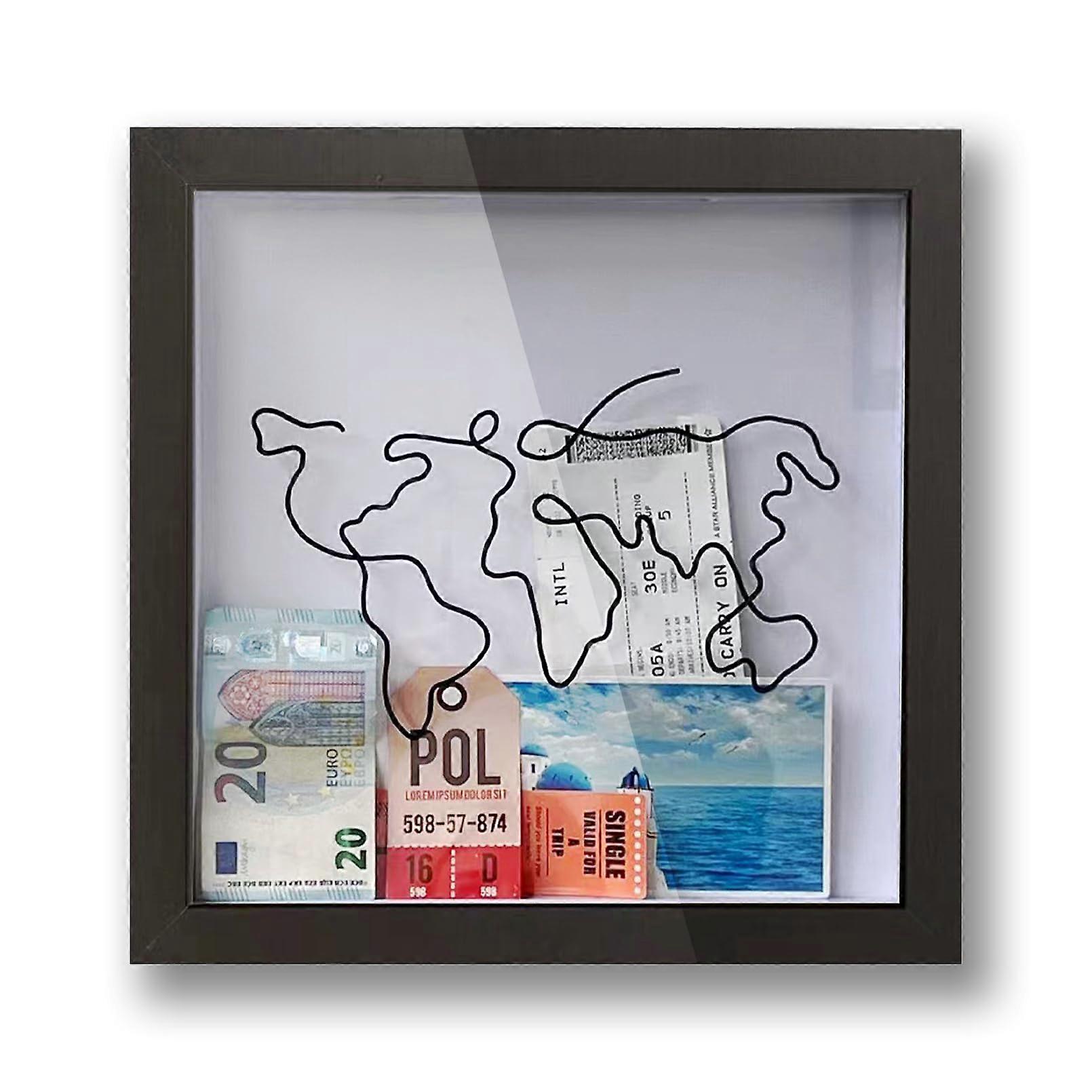 Shadow Box Frame for Travel Memories with Quick Insert Slot, World Map Wooden Keepsake Display Box, 8 Inch Black