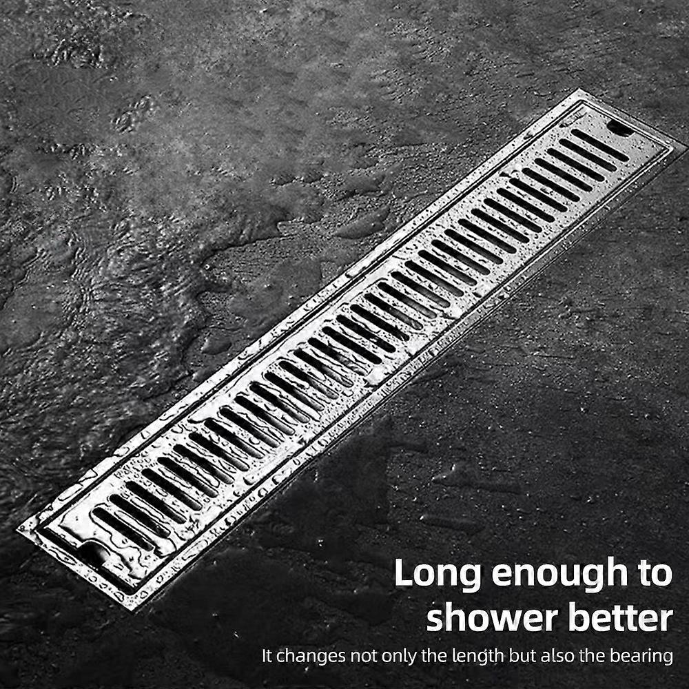 Linear Shower Drain 27.5 Inch with Hair Strainer 3In Outlet Smell Proof Modern 304 Stainless Steel Bathroom Floor Drain with Removable Grate Quick Drainage Rectangular Shower Drain Features: 【Large Displacement and 4 Size Optional】Linear shower drain size: 20''/24"/27.5''/31.5'' length, 4" width, 3" central outlet. 30 L/min high flow capability. Larger displacement compared with traditional small shower drain grill. 【Durable Material】Bathroom drain is mainly made of high-quality 304 stainless steel with brushed nickel process on the surface, which has stronger corrosion resistance and rust resistance. 【Universal Design】Drain outlet of bathroom floor drain is 3 inch in central, which is universal fit for various drain base system. Suitable for kitchen, bathroom, garage, basement and toilet, and also smell proof, keeping insects and mice from entering the house. 【Smooth and Safe】Durable stainless steel drain is strong enough to support adult as well as allows wheelchair access. Delicate manual polishing and cutting make the surface smoother, not hurt your hands and won't be stumbled. 【Easy To Maintain and Clean】Shower floor drain with removable grate. The filter prevents hairs from falling into sewer for an anti-clogging effect. The inner strainer automatically closes when there is no water. Specification: Color: Silver Material: 304 Stainless Steel Length: 50cm/20in , 60cm/24in , 70cm/27.5in , 80cm/31.5in (optional) Outlet: 3 inch in central Flow capability: About 30L/min 50cm Size: 50 * 10 * 6.5cm / 19.7 * 3.9 * 2.5in 60cm Size: 60 * 10 * 6.5cm / 23.6 * 3.9 * 2.5in 70cm Size: 70 * 10 * 6.5cm / 27.5 * 3.9 * 2.5in 80cm Size: 80 * 10 * 6.5cm / 31.5 * 3.9 * 2.5in 50cm Weight: 800g / 28.2oz 60cm Weight: 1000g / 35.3oz 70cm Weight: 1200g / 42.3oz 80cm Weight: 1400g / 49.4oz Packing List: 1 * Shower drain