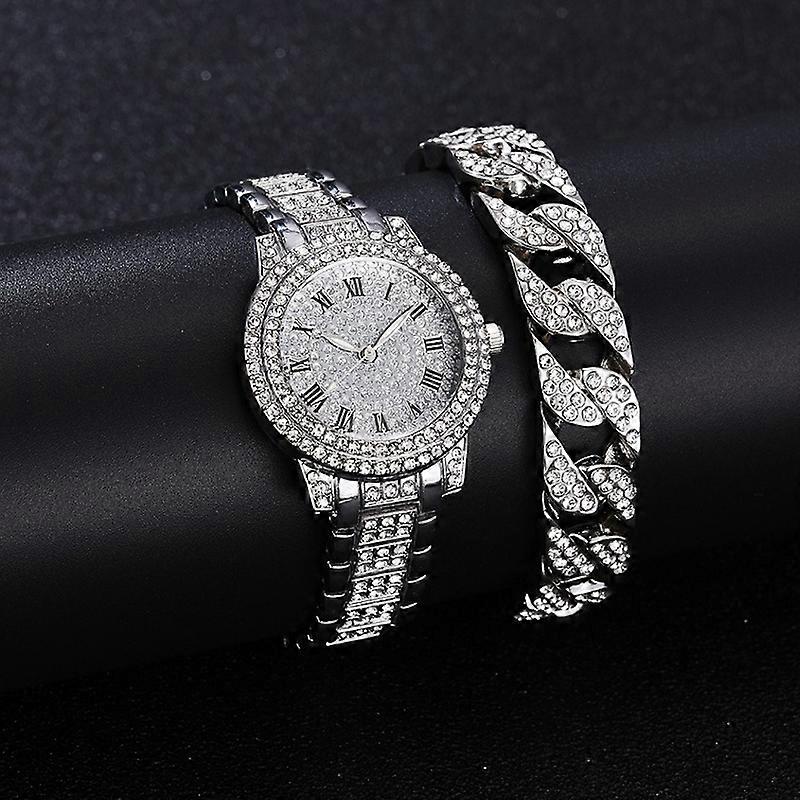 Full Diamond Roman Literal Steel Strap Quartz Watch, Color: Silver+Bracelet