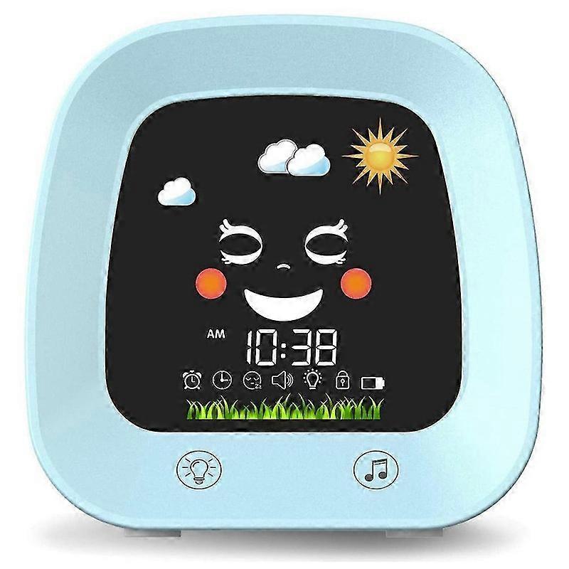 [HEALTHY SLEEP HABITS START EARLY] With our multi-functional kid's alarm clock that is specially designed to wake your gently for a start to (leaving us ) This kids digital alarm clock uses fun facial expression and soft colors to teach your child when it is time to sleep and okay to wake up. [SOUND MACHINE & NIGHT LIGHT]This kids alarm clock with seven sleep sound and four color night light gives a tender to your little ones especially when they learn to sleep alone. [MULTI-FUNCTIONAL ALARM CLOCK FOR KIDS]To get extra 10 minutes sleep you can pause alarm very quickly by pressing SNOOZE button without opening eyes in the morning. Individual buttons for an easy set time, alarm, light, sound, sleep/wake time and easy to change 12/24 hour format. [SETTING PRESERVED & CHILD LOCK]Toddler alarm clock has a built-in button battery, it just could keep time memory when power off, couldn't support the digital clock light up. [perfect GIFTS FOR KIDS AND TEEN]This toddlers sleep training clock is perfect for toddler who do not yet have a good concept of time. Stylish appearance and child-friendly design perfect as a gifts for girls/boys birthdays christmas, Hanukkah, and New Year 's. color:Blue Material: ABS Package Contents: 1 x Alarm clock 1 x USB cable Only the above package content, other products are not included. Note: Light reflection and different displays may cause the color of the item in the picture a little different from the real thing. The measurement allowed error is +/- 1-3cm.