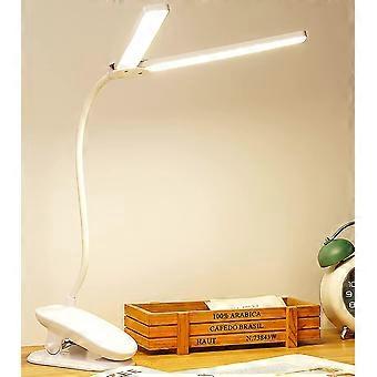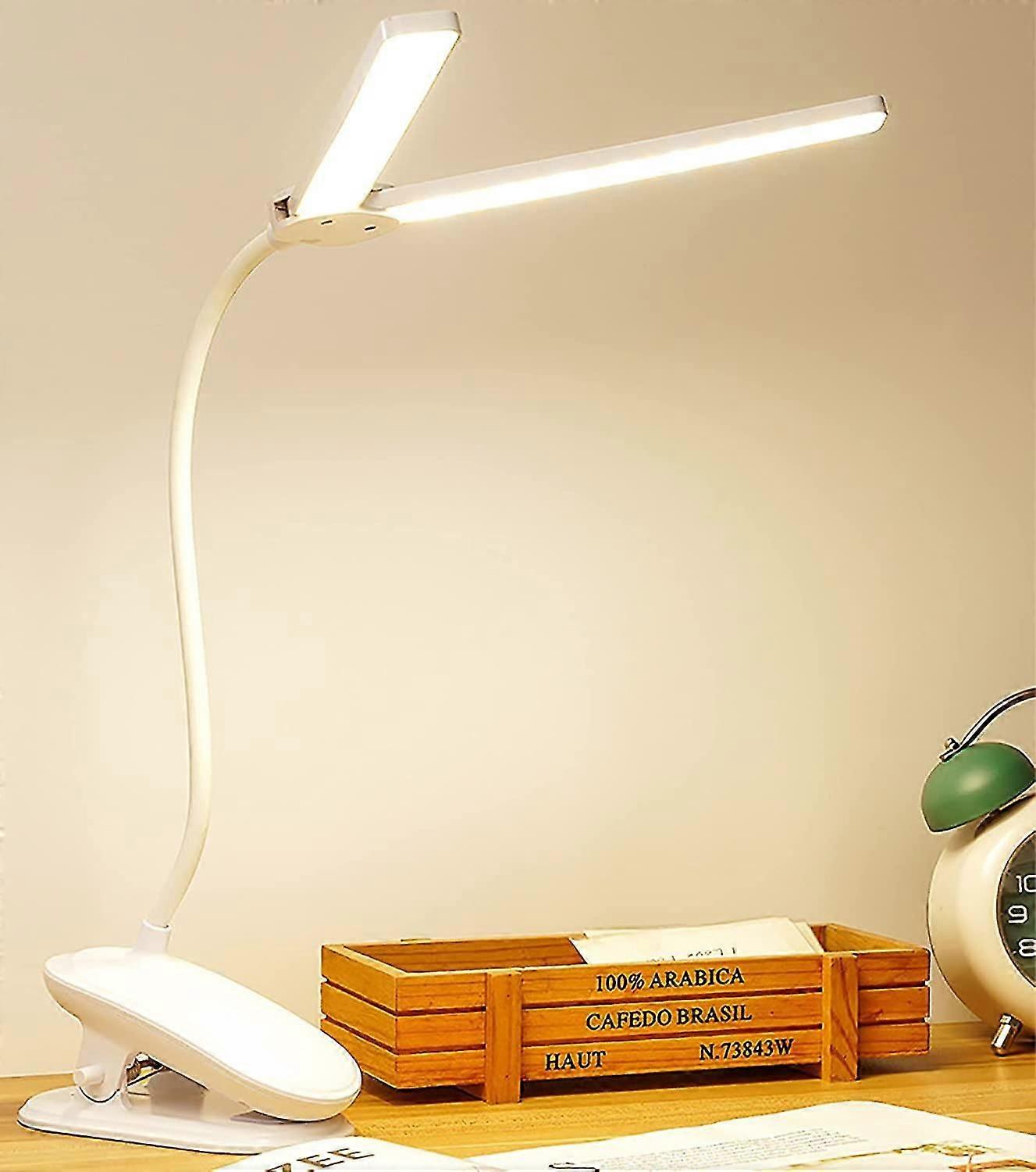 [Eye Protection Lamp with Two Arms]The desk lamp provides soft light to protect eyes, no flickering, no dizzy light, and no shadow. The lamp can avoid eye fatigue caused by flickering light and strong glare, ideal for long time reading and studying. [Stepless Brightness and 3 Color]3 color temperatures and stepless brightness adjustable to best suit your needs. Single press to select color temperature and long press to adjust brightness. [USB Rechargeable]With the built-in 2000mAh battery. The LED reading lamp can be operated with any USB charger, e.g. laptop, PC, power bank, mobile phone power adapter and car charger. It can also be charged with a regular USB cable (included). [360 Flexible Gooseneck]The neck can be freely rotated 360, arms spread about 40cm, offering you the best angle for reading. Ideal for study, bedroom or office. [Wide Range of Applications]The clip can be opened up to 7cm maximum, so you can fix this reading lamp on book, desk, headboard, shelf, bookshelf, wardrobe, music stand, piano and computer etc.