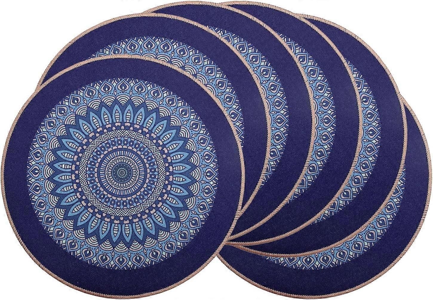 Round Boho Placemats Set of 6, Rubber Heat Resistant Tabel Mats, Waterproof Washable Placemat for Dining Table Decoration (Deep Blue)