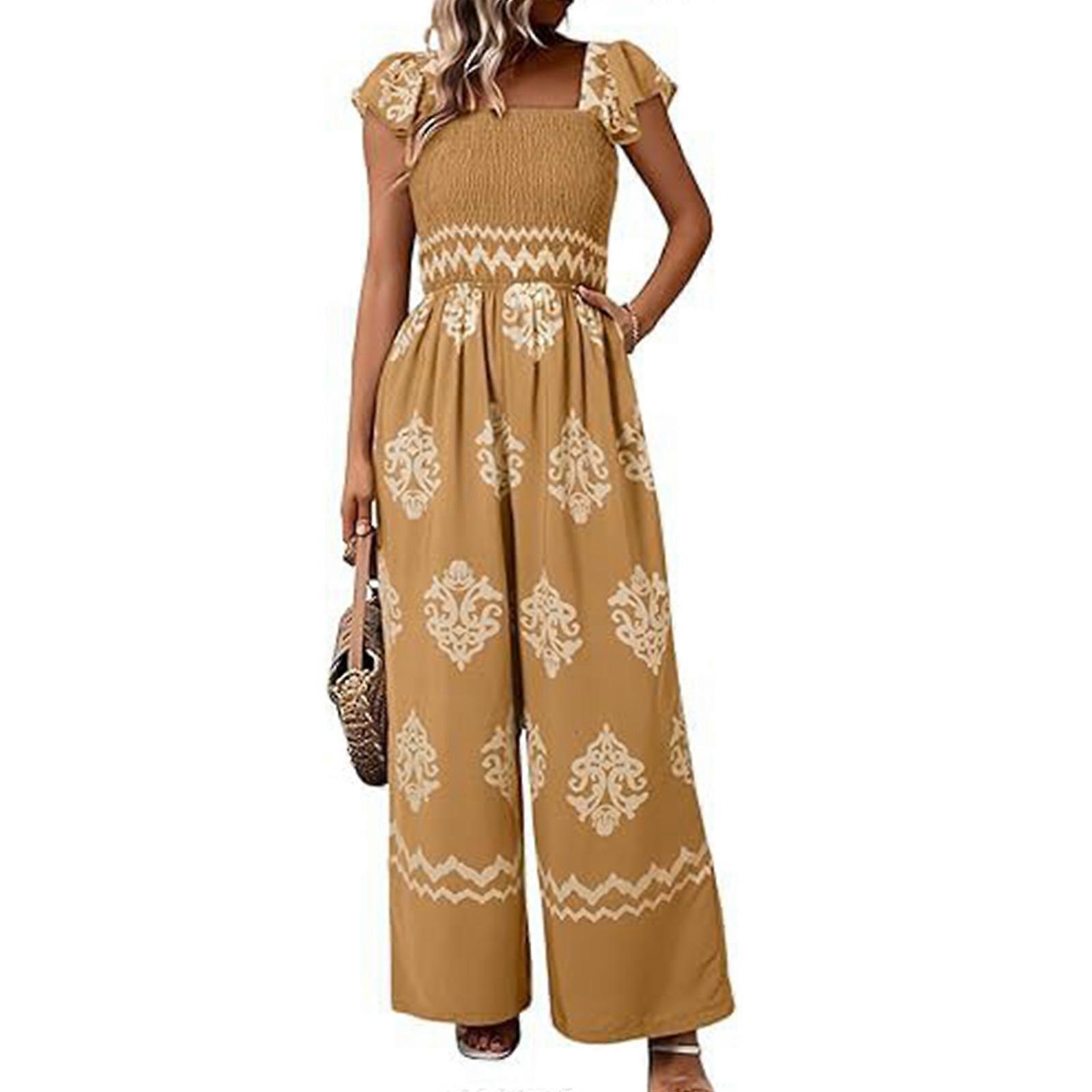 Summer Vacation Outfit Women's Sleeveless Ruffle Smocked Overalls Bohemian Printed Wide Leg Jumpsuit Romper with Pockets Khaki XL