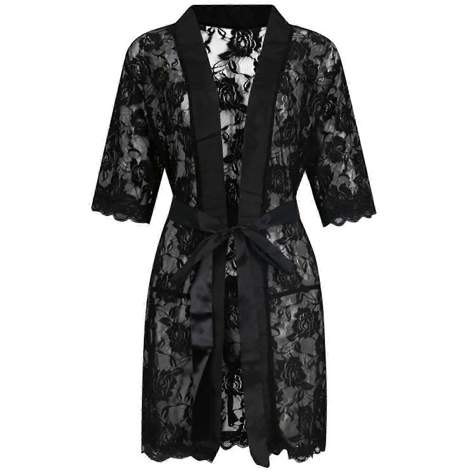 Mens See Through Floral Lace Kimono Robe with Satins Belt and G-String Half Sleeve Sheer Lace Bathrobe Pajamas Nightgown Black M