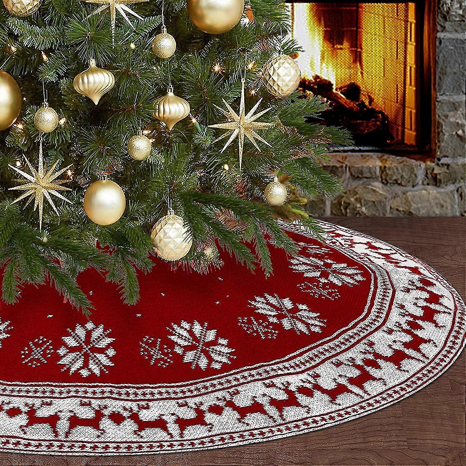 Christmas Tree Skirt, 36 Inch Red Reindeer Snowflakes Christmas Tree Skirts Thick Knitted