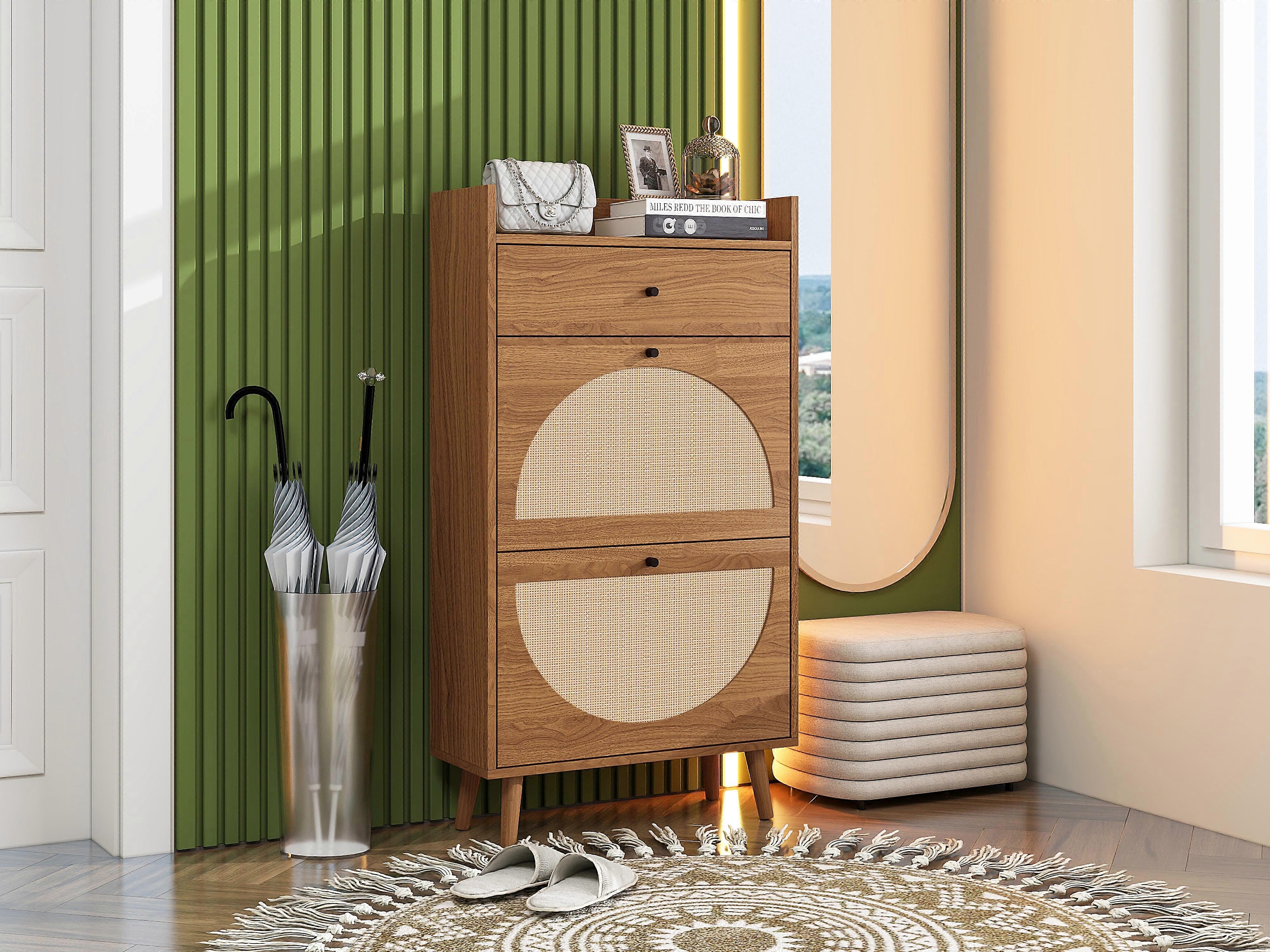 Wooden Shoe Cabinet Rattan Style Doors Double Shelf 60cm Hallway Storage