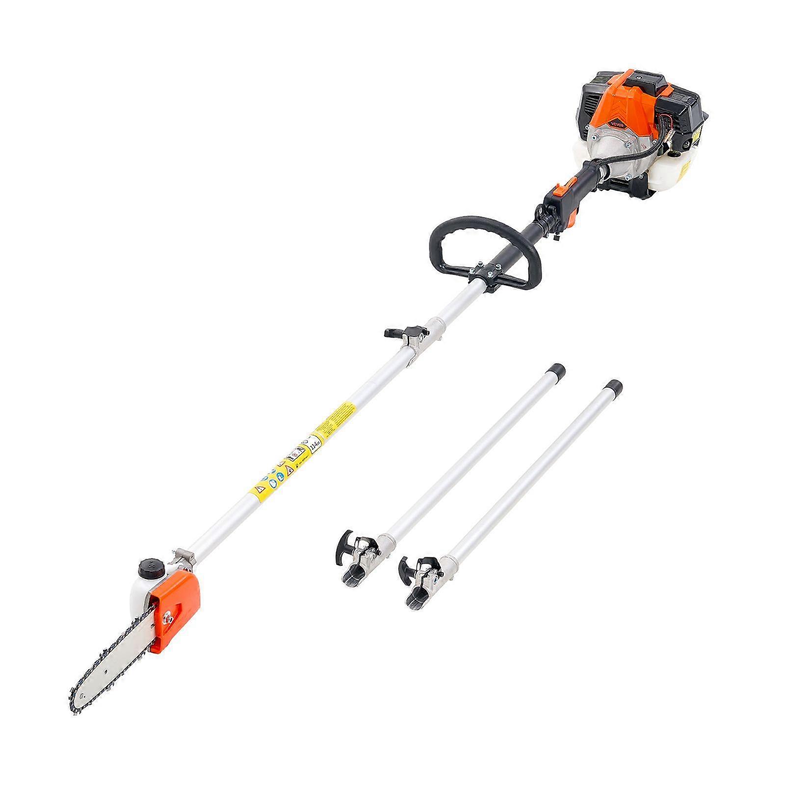 *KeyFeatures *Powerful Performance: Powered by a 33 cc two-stroke gasoline engine, delivering 1.2 hp and reaching up to 12,000 RPM for fast branch cutting. The 2 stroke pole saw features one 33.7 in (85.5 cm) extension pole, extending from 6.7 ft (2.04 m) to 11.6 ft (3.54 m) to handle branches at various heights. *User-Friendly Operation: The gas pole saw comes with a 30 fl. oz. (850 ml) fuel tank for extended operation and 5.28 fl. oz. (150 ml) chain oil reservoir for smooth lubrication. The detachable extension pole reduces transport strain, while the lightweight design (19.6 lbs / 8.9 kg) with shoulder strap and anti-slip handle minimizes fatigue during long use. *Reinforced Design: Thickened alloy vertical rods resist pressure and bending, and the enlarged pull cord switch is durable. Rust-resistant aluminum alloy is ideal for outdoor use and prevents corrosion. The 3/8 LP alloy steel chain with 8 in (20.3 cm) guide bar easily cuts branches up to 6 in (15 cm) thick. *Complete Accessories: The tree trimmer chainsaw on pole includes engine, extension poles, oil bottle, guide bar, chain, chainsaw cover, mixing bottle, protective components, shoulder strap, installation tools, and a detailed manual for easy assembly. *Versatile Use: This gas powered pole saw is ideal for trimming fruit trees, clearing farm branches, landscaping, and emergency fire-fighting. No need for electricity or batteries, making it perfect for outdoor use without limitations on cord length. ******************************************************************************************************* *Specifications Item Model Number: 3300 Engine Stroke: 2-Stroke Displacement: 33 cc Power: 1.2 HP Engine Speed:0.75kw/8500rpm; Max.12000rpm Fuel Tank Capacity: 30 fl.oz. / 850 ml Chain Oil Tank Capacity: 5.28 fl.oz. / 150 ml Guide Bar Length: 8 in / 20.3 cm Guide Bar Rotation: Non-Rotatable Chain: 3/8LP, 33 links Max Cutting Diameter: 6 in / 150 mm Extension Poles: 1 Product Length (with Extension Pole): 11.6 ft / 3.54 m Product Length (without Extension Pole): 6.7 ft / 2.04 m Pole Sections: 4 Net Weight: 19.6 lbs / 8.9 kg Product Dimensions (L x W x H): 10.8 × 8.9 × 8.9 in / 275 × 225 × 225 mm Extension Pole Material: AL6063 Extension Pole Thickness: 0.08 in / 2 mm Extension Pole Dimensions (L x W x H): 33.7 × 6.1 × 2.8 in / 855 × 155 × 70 mm Oil Rod Material: AL6063 Oil Rod Thickness: 0.08 in / 2 mm Oil Rod Dimensions (L x W x H): 33.7 × 4.7 × 2.8 in / 855 × 120 × 70 mm Guide Bar Material: 45# Steel Guide Bar Length: 8 in / 20.3 cm Chain Material: Alloy Steel Chain Specification: 3/8LP, 33 links ******************************************************************************************************* *Pakcage Content 1 x Pole Saw 1 x User Manual 1 x 33 cc Engine 1 x Extension Pole 1 x Oil Rod 1 x Guide Bar 1 x Chain 1 x D-Type Guard Assembly 1 x Single Shoulder Strap 1 x Chainsaw Cover 1 x 0.5L Mixing Pot 1 x Funnel 1 x 13-19 1.8mm White Cross Oil Saw Socket 1 x Hex Wrench #3 1 x Hex Wrench #4 1 x External Hex Wrench 1 x Screwdriver 1 x Earplugs with String