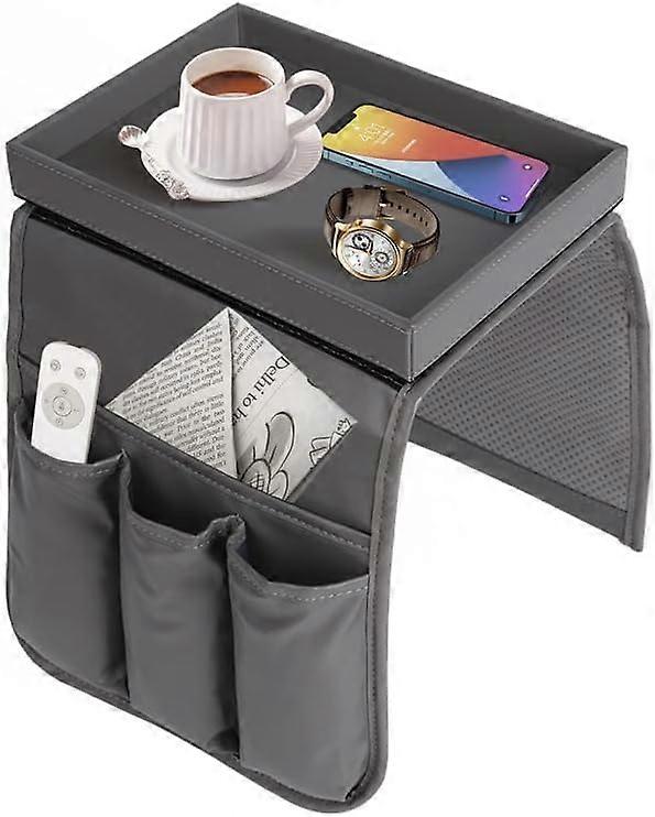 Sofa Arm Tray Remote Couch Control Stand with Removable Tray PU Leather Chair with 5 Pockets(Grey)