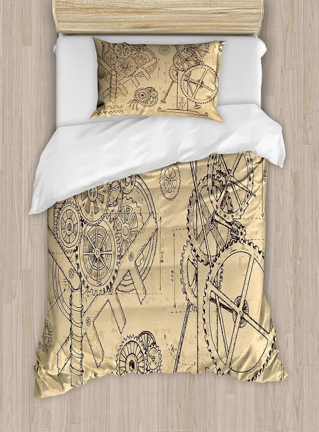 Steampunk Duvet Cover Set, Retro Mechanism Print, 3-Piece Bedding with 2 Pillowcases, Beige Brown