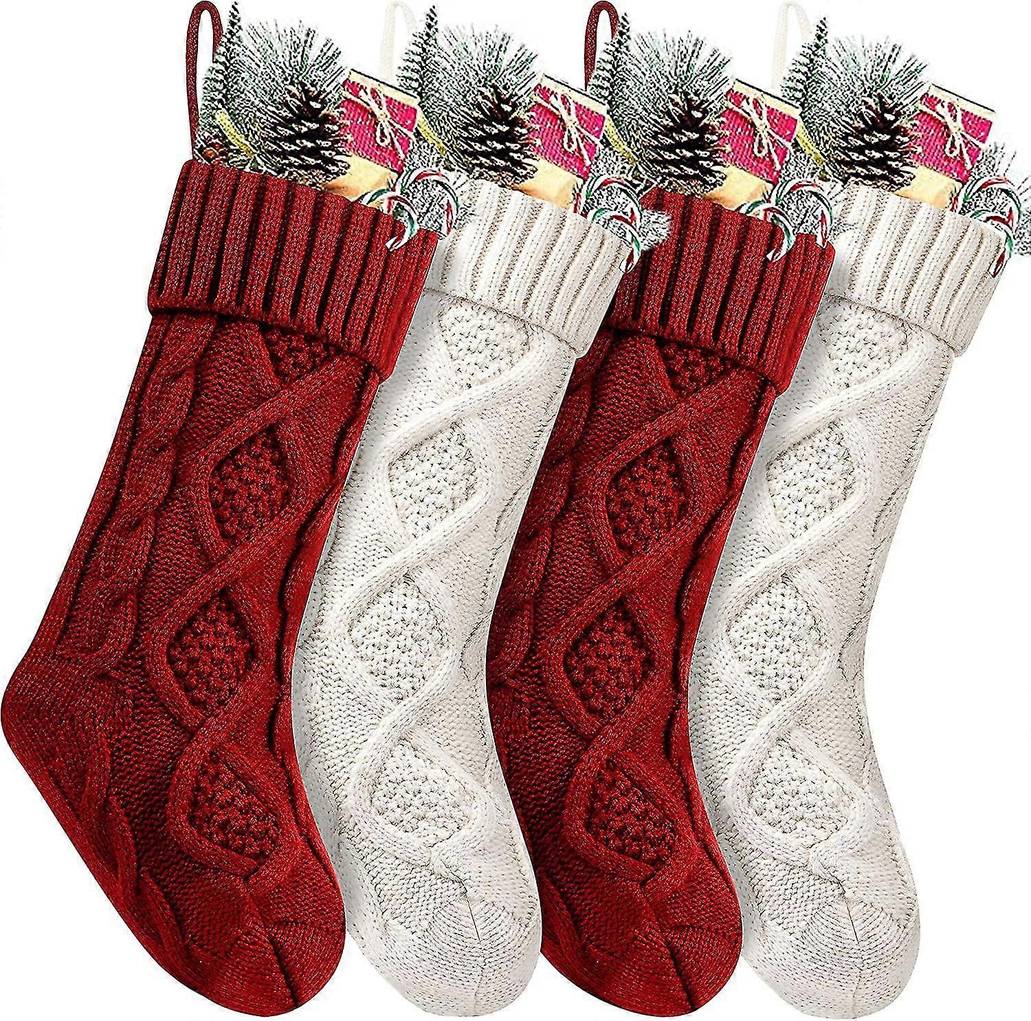 1.Christmas Stockings Set 1 Pack christmas stocking in total, they are in large size 18'' long with 5'' wide. It has enough space for gifts putting, also the large size more good for hanging decoration. Burgundy and Ivory white are the most popular color to attract more attention and add Christmas atmosphere. 2.Knit Christmas Stockings Our Christmas Stockings are made of high-quality classic knit pattern. The cable knit pattern make the stockings shaped beautifully, and the Twist style weaving pattern give you warm feel, create beautiful holiday memories. What's more, the soft acrylic fabric is elastic and can hold more gifts. 3.Wide ApplicationsThese Christmas Stockings is large enough for small gift,for you to fill candies or chocolates,watch,folding wallet,ties,gift cards,small toy cars, etc. It also can as Christmas decorations, easy to hang on stocking holders or fireplace mantel, wall and doors. Christmas stockings sets are suit for home, farmhouse, window even hotel. 4.Perfect Christmas Gift Christams design stocking also bring warm feeling to child and adults, espatially family. It has large enough space for stuffing small gifts, so it is a nice gift for your child, friends, family or colleagues. Use them to enjoy the Christmas atmosphere, also can leave wonderful memories for child.
