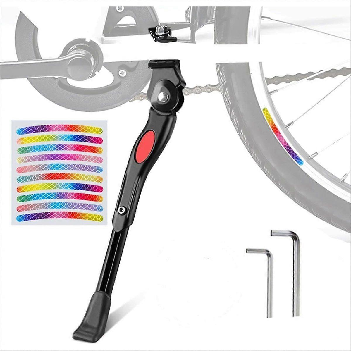 This bike kickstand fits 24inch 26inch 27.5inch 29inch bike, suitable for most mountain bike, road bicycle, kids bike, etc. Stable & Anti-skidding - Made of strong and Aluminum Alloy with anti-slip pad, can prevent the bicycle from slipping on wet surfaces Easy To Install - Two hexagon wrenches are included with the package, you can easily install the bike kickstand to your bike Length Adjustable - You can use the attached small hex wrench to loosen the middle of the parking support and adjust its length to find the most suitable parking angle Color: As Shown Material: Metal Package Contents: 1 x bicycle stand 2 x hexagonal wrenches 1 x car sticker Only the above package content, other products are not included. Note: Light reflection and different displays may cause the color of the item in the picture a little different from the real thing. The measurement allowed error is +/- 1-3cm.