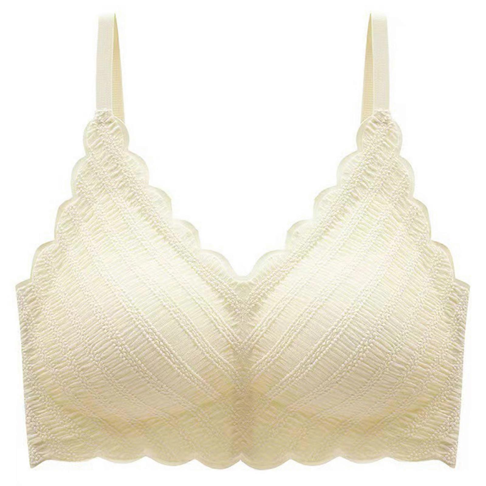 Women’s Seamless Wire Free Bralette Lace V Neck Padded Push Up Bra Wireless Crop Tops with Adjustable Straps Bralette cream yellow XL