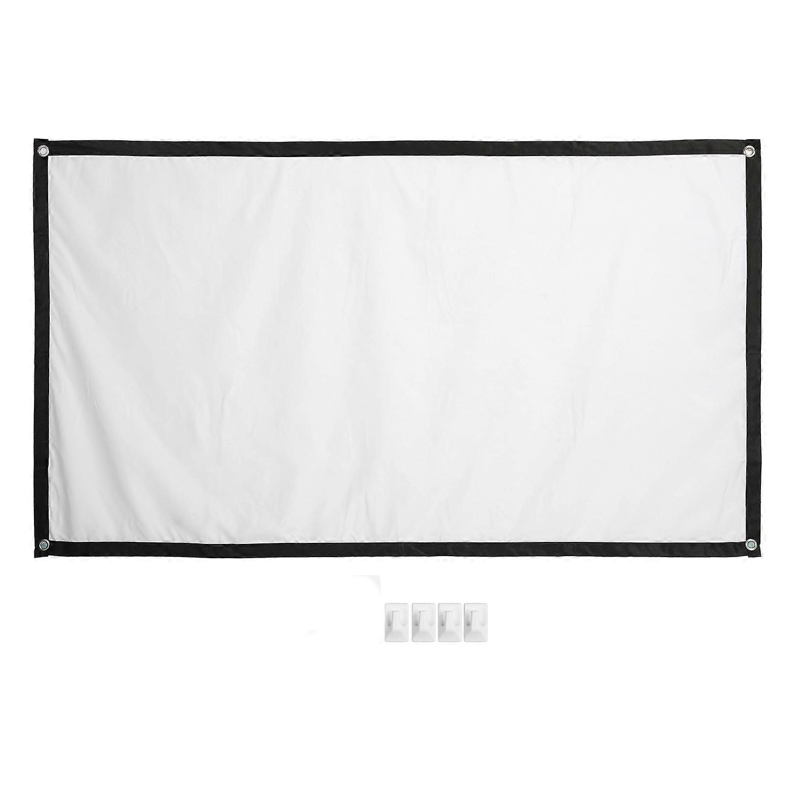 Features 1.BRIGHT AND CLEAR: Movie projector screen is made of soft touch and flexible thick polyester material that ensures wrinkle free, clearer and brighter projection when folded or compressed. 2.180 DEGREE 60 INCH: Projection movies screen with a 180 degree wide viewing angle and large 60in size, allowing you to simply choose the most comfortable viewing position and enjoy a great movie night. 3.PERFECT FOR YOU: 60 inch projector screen works in most situations, displaying movies, sports games, photos, music videos, games, and more to make your life more fun. Suitable for indoor and outdoor use. 4.EXCELLENT GIFT: Outdoor projection screen can be used as a gift for family, friends, and loved ones to enhance relationships by watching or talking about movies or episodes from certain holidays. 5.APPLICABLE SCENES: Projector screen is suitable for home theater, business meetings, exhibitions, conferences, presentations, etc. It is easy to install and can be hung on the wall using hooks (included in the package). specificationItem Type: Projector Screen_x000D_ Material: Polyester_x000D_ Size: 60 Inch_x000D_ Aspect Ratio Display: 16:9_x000D_ Viewing Angle: 180 Degree_x000D_ Scope of Application: Indoor and Outdoor Projection Screens for Movies or Office Presentations PackageList1 x Projector Screen4 x Hook(Hook Randomly)