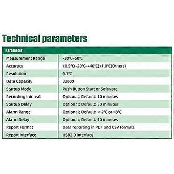 This product is mainly used to monitor and record the temperature data during transportation and storage. Intuitive LCD display. The LCD displays all key information, including recording statistics, alarms and running status. No software needed to generate PDF and CSV temperature report. Built-in USB 2.0 interface, can quickly connect with PC anytime and anywhere, without cables and to download data. Parameter programmable by configure software. This date logger is mainly used for temperature recording during storage and transportation of foodstuff, chemicals and other products, especially widely used in all links of warehousing, logistics and cold chain, such as refrigerated containers, refrigerated trucks, refrigerated package, cold storage, laboratory, etc. Specifications: Measuring Range: -30 -60 Accuracy: 0.5(-20-+40 ), 0.1(other) Resolution: 0.1 Data Capacity: 32000 Start Mode: Button Start or Software Recording interval: optional; default value: 10 minutes Start delay: optional; default value: 30 minutes Alarm range: optional; default value: Less than 2 or 8 Alarm delay: optional; default value: 10 minutes Form of Report: PDF and CSV format data report Interface: USB2.0 Interface Colour:White & Green Material:plastic The actual product may have slight color difference or difference, which not affect the use Package Contents: 1 * Temperature Recorder Only the above package content, other products are not included. Note: Light reflection and different displays may cause the color of the item in the picture a little different from the real thing. The measurement allowed error is +/- 1-3cm.