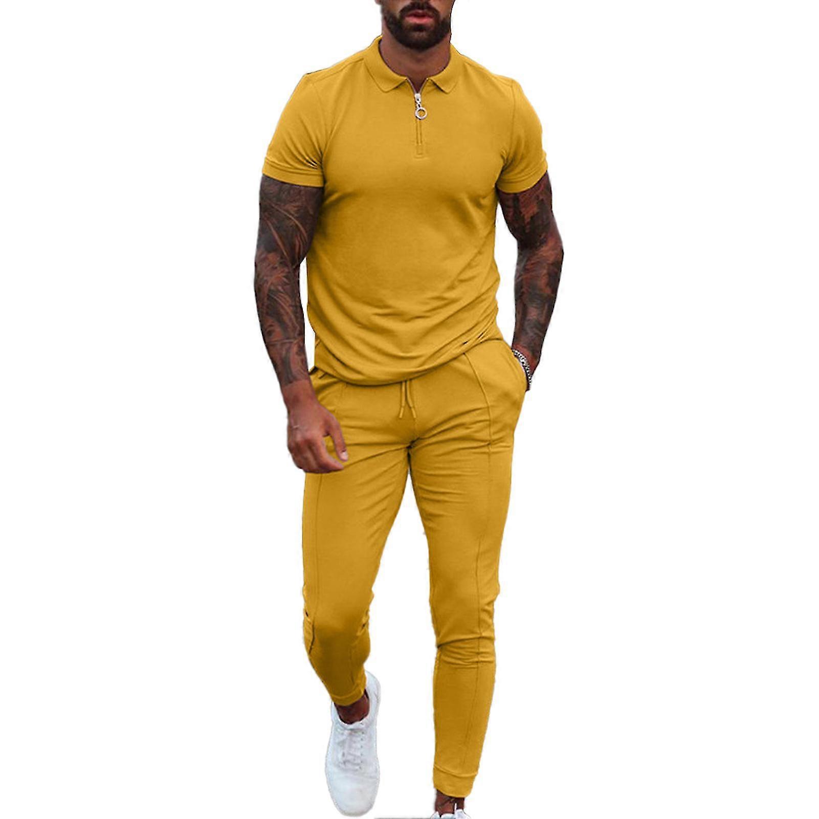 Men's Yellow Leisure Suit with Turn Down Collar, Short Sleeves, Zipper Waistband, and Long Pants