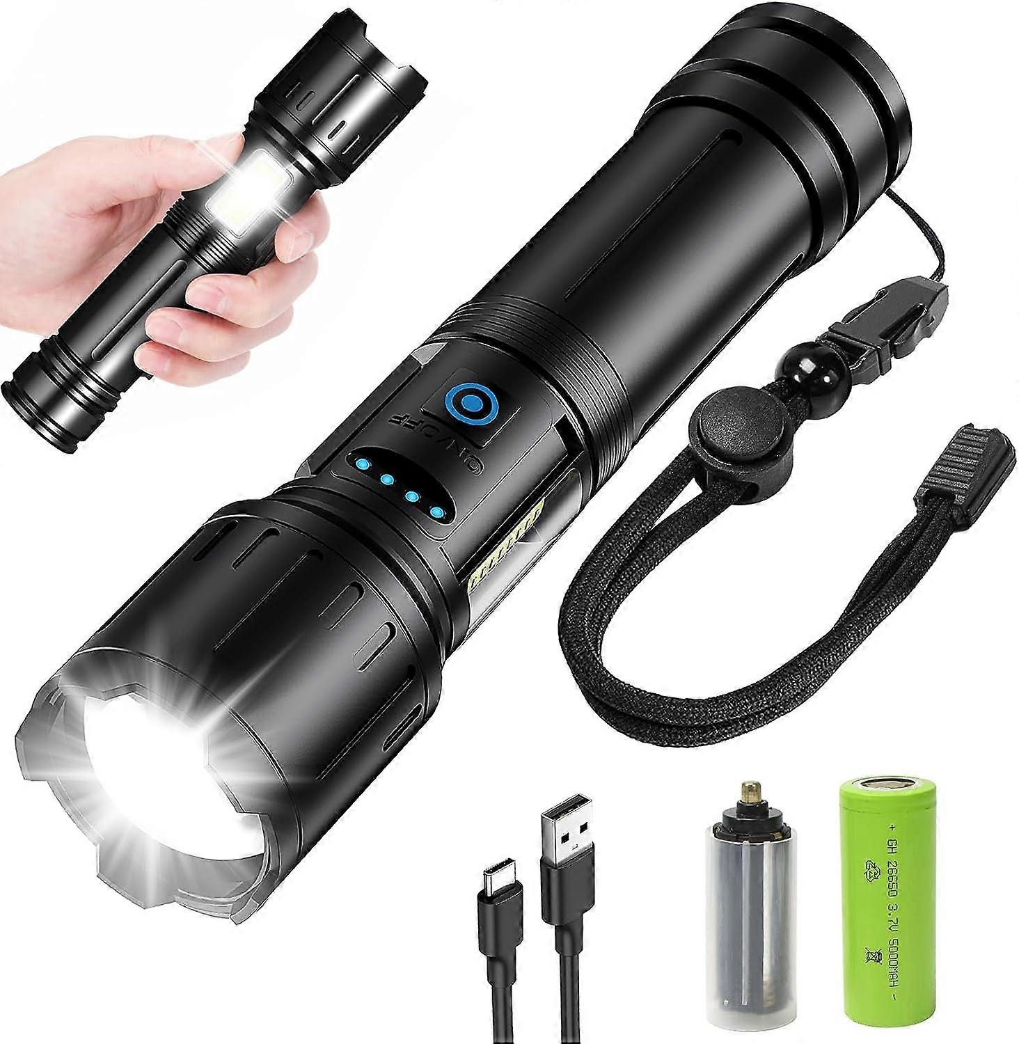 [10000 Lumens LED Flashlight] - This rechargeable LED flashlight is equipped with advanced XHP70.2 LED chip, stable and super bright, 20 times brighter than ordinary bulbs. Easily light up an entire room and a maximum beam distance of up to 1000 meters! [7 light modes/upgraded switch] - This flashlight has 7 light modes: strong light, medium light, strobe, COB strong light, COB medium light, COB red light, COB red light strobe. A single press of the switch turns on the main light in normal mode, a quick double press of the switch turns on the side light in COB mode. [Powerful Battery/Charging/USB-C Output] - The flashlight is equipped with a standard 5000 mAh 26650 battery which provides more than 5 hours of battery life. The flashlight is equipped with a USB-C charging port for easier and faster charging. It also features an outlet design that can charge cell phones and other electronic devices in an emergency. [Waterproof and sturdy] - The flashlight is made of high-quality aviation aluminum alloy, and the surface coating has been specially oxidized to make it wear-resistant and drop-resistant. The waterproof rating of this flashlight reaches IP65 and can be used in many adverse weather conditions, but avoid submerging it in water. [Good value for money] - The set includes: 1 x flashlight, 1 x rechargeable battery, 1 x USB-C charging cable, 1 x AAA battery adapter, 1 x strap, 1 x user manual. After receiving the flashlight, please check the product first for quality problems, if there are any problems, please contact us first and we will handle them for you in time.