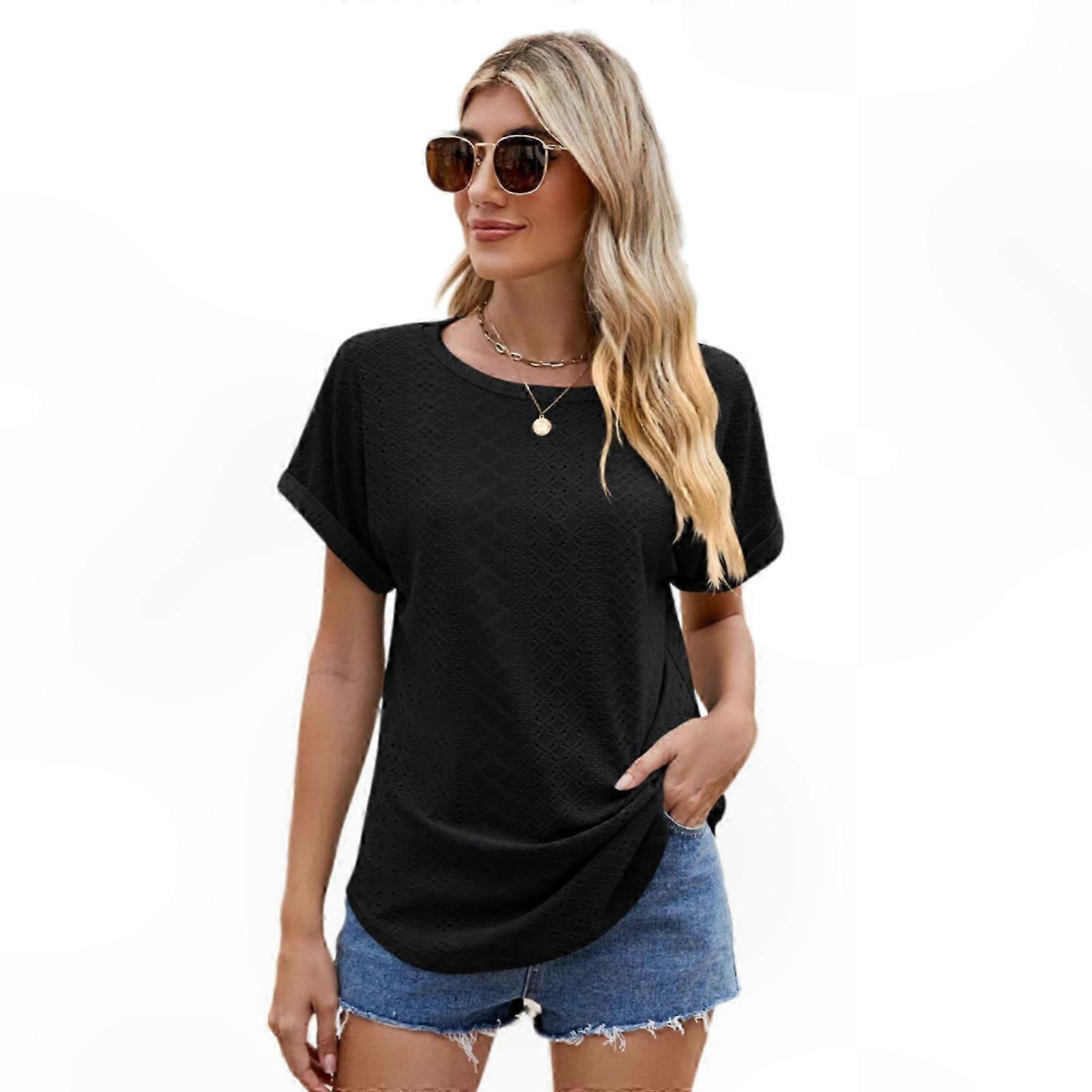 Women's Casual Short Sleeve Top with Lace Eyelet Embroidery and Curved Hem for Summer