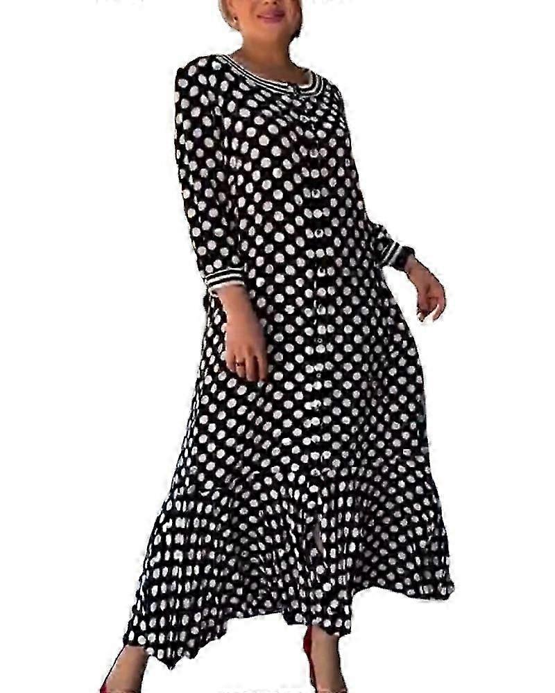 "Polka Dot Print Dress, Casual Crew Neck Button Front Bracelet Sleeve Ruffle Hem Dress, Women's Plus Size Clothing"