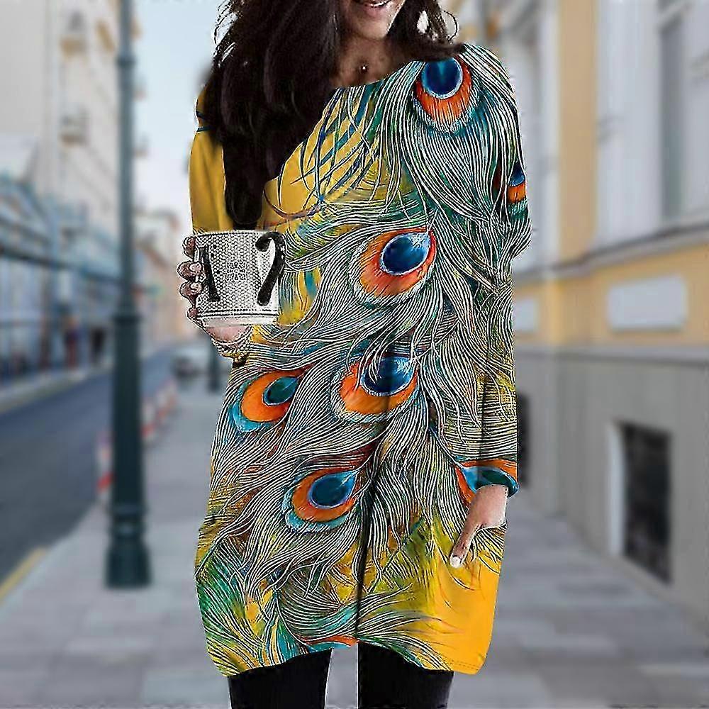 Women's floral dress with crew neck, Plus size dress featuring peacock feathers design, Practical pocket dress for seasonal wear.