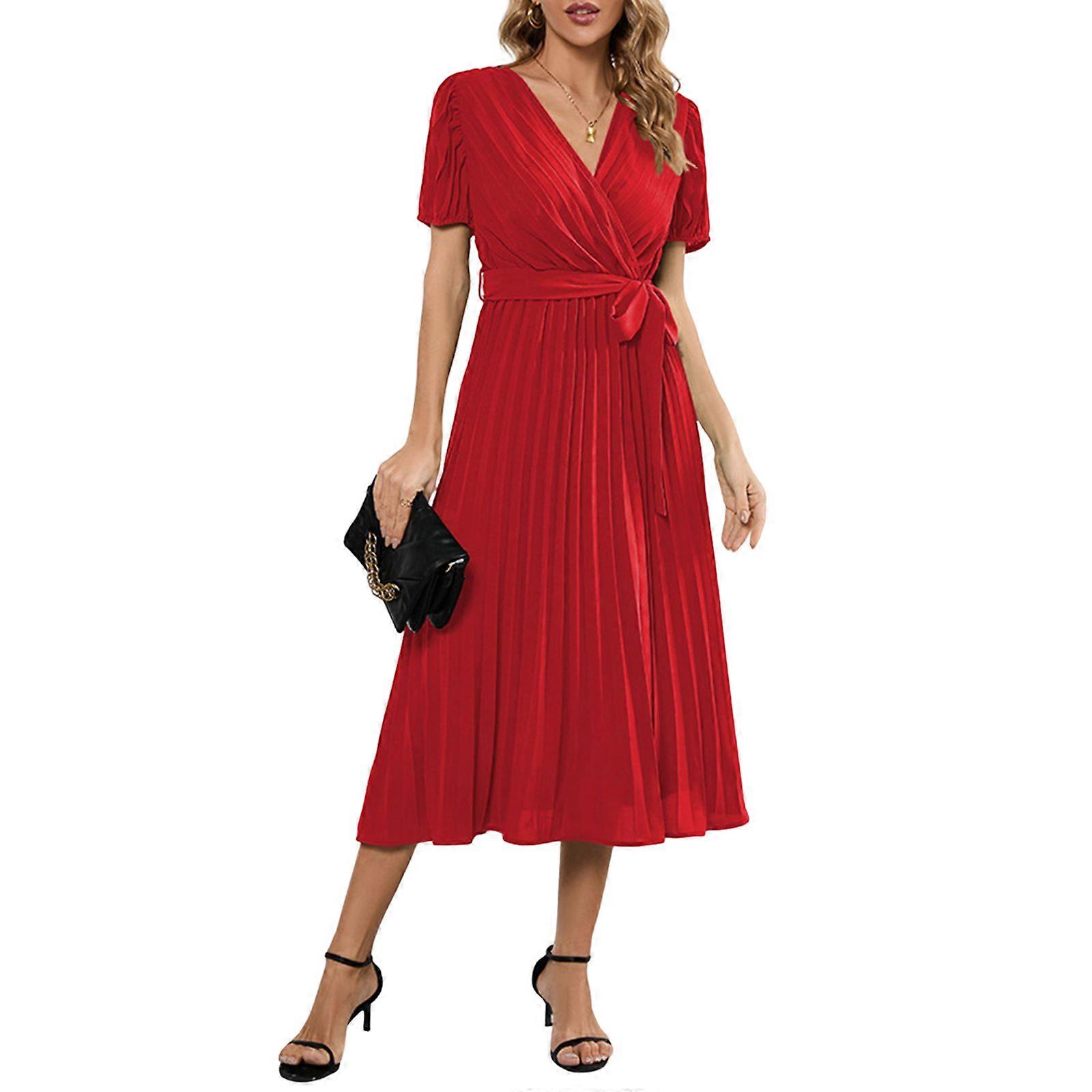 Womens Puff Short Sleeve Wrap V-Neck Solid Color A-Line Midi Dress Belted High Waist Pleated Flared Ruffle Swing Dresses Red XL