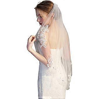 1 Tier Lace Appliques Bridal Veil Crystal Beaded Tulle Wedding Veils with Comb Ivory -