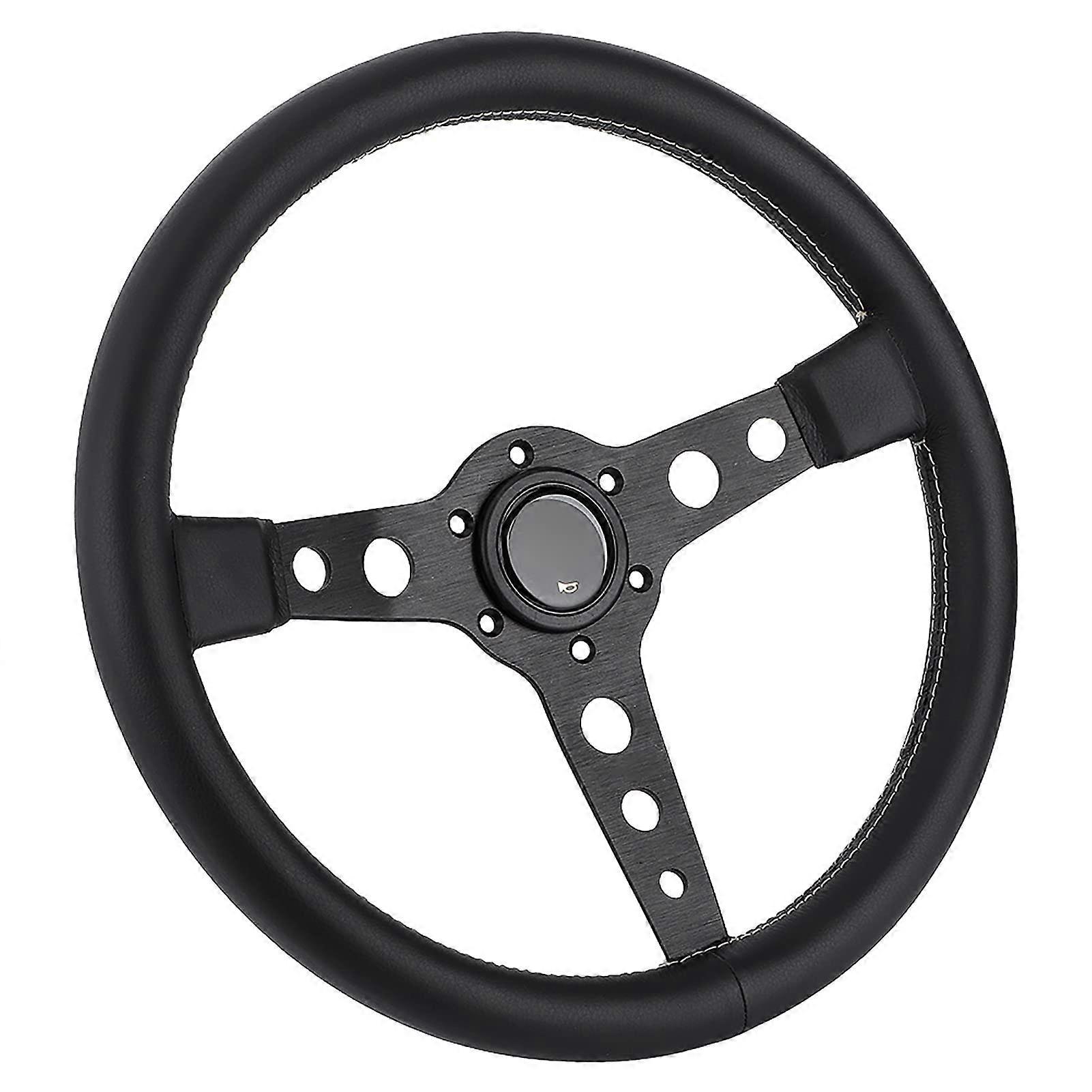 1. materials: Made of quality aluminum alloy and wrapped in durable leather, this racing steering wheel delivers both power and comfort. The sleek black spokes and stylish gray stitching add a touch of sophistication to your driving experience, for racing enthusiasts who demand performance and aesthetics. 2. size and design: With a diameter of 350 mm and a builtin depth of 37 mm (1.5 inches), this steering wheel offers grip and control. The Prototipostyle screw/fastener design ensures a secure fit, while the ergonomic shape enhances precision. Ideal for performance racing and adventure driving. 3. Universal Compatibility: Designed to fit a wide range of vehicles, this universal steering wheel is a versatile choice for car enthusiasts. Note that hub adapters are not included—please verify compatibility before . Its elegant design and functionality make it a musthave for any race setup. 4. Enhanced driving experience: The included horn button adds comfort and safety to your drive. The lightweight yet durable construction minimizes fatigue on long journeys, while the textured leather handle ensures a firm grip. Transform your car into a raceready machine with this performance steering wheel.