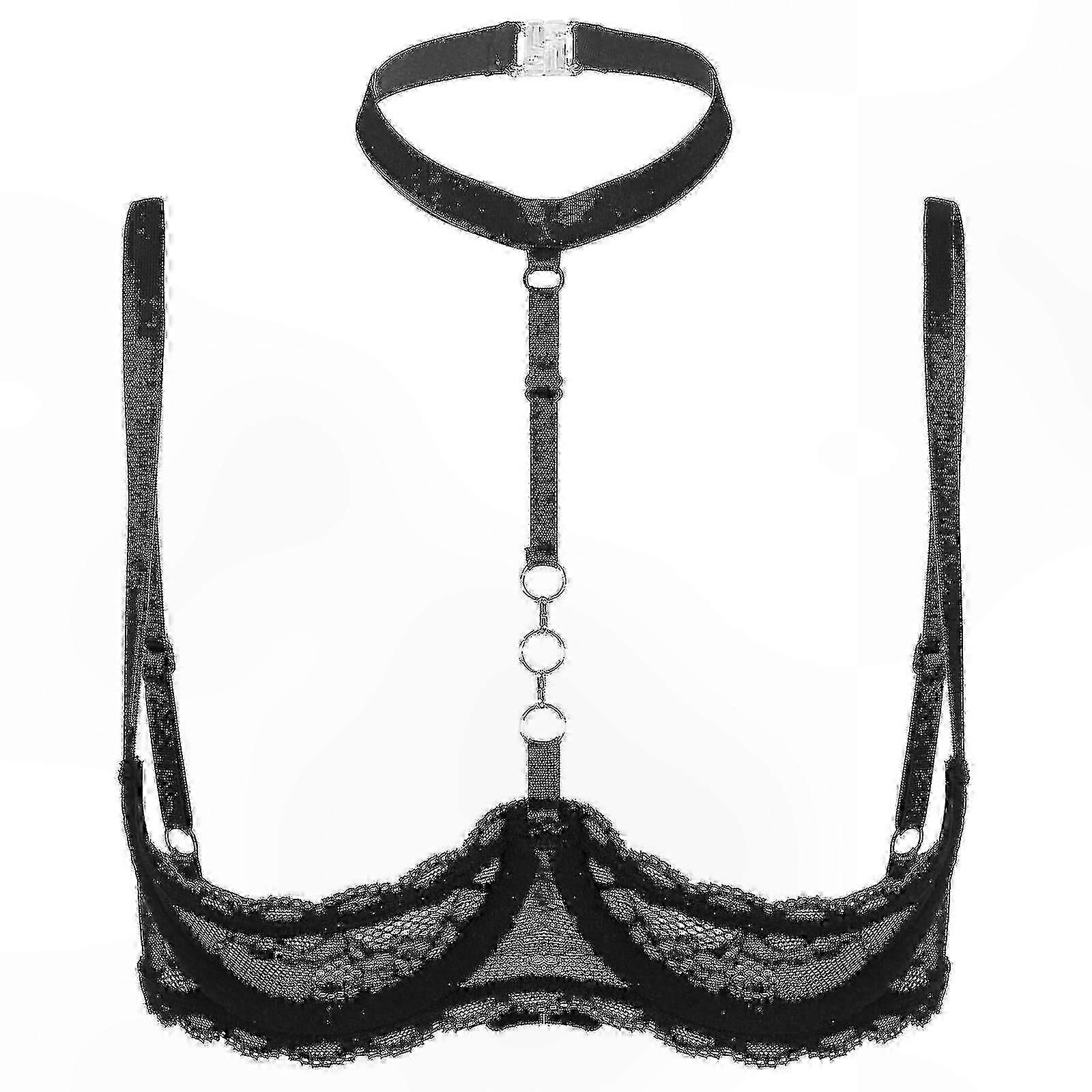Women's Lace Halter Bra with Underwire Support and O-Ring Detail Push-Up Lingerie Open Cup Design