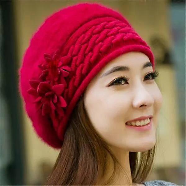 WTEMPO Women's Warm Wool Flowers Knitted Hats Versatile Outdoor Large Hats Berets Fall Winter Solid Color Retro Casual Hats