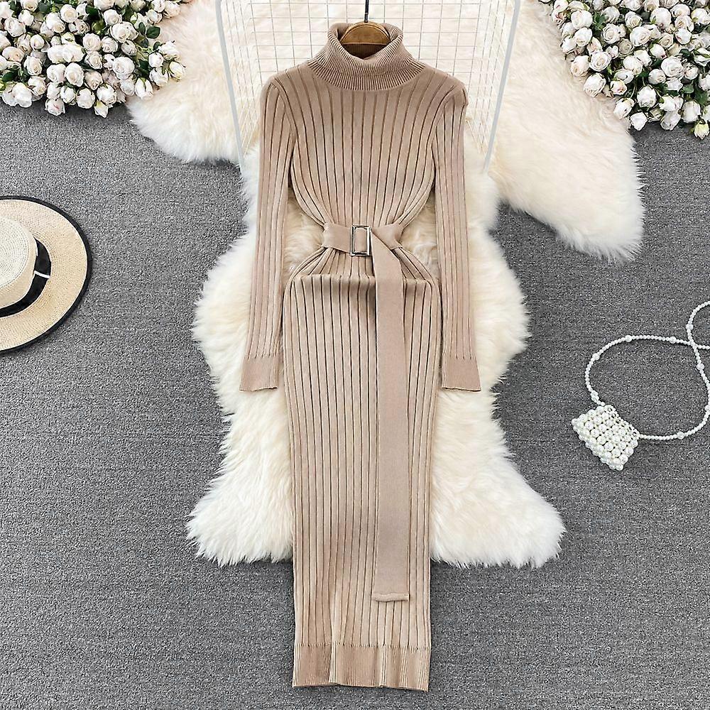 YuooMuoo Women's Knitted Bodycon Dress with High Neck and Long Sleeves Elegant Style with Belt Hip-Wrapping Design Suitable for Autumn and Winter