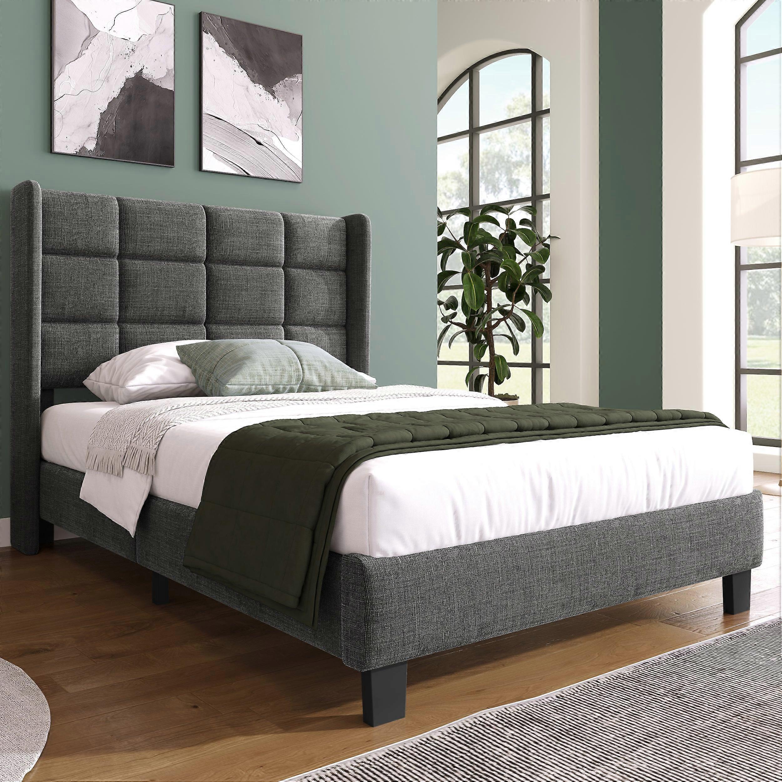 (Z)Modern Design Upholstered Bed - 90x200cm Grey Linen Single Bed with Headboard, Mattress Not Included